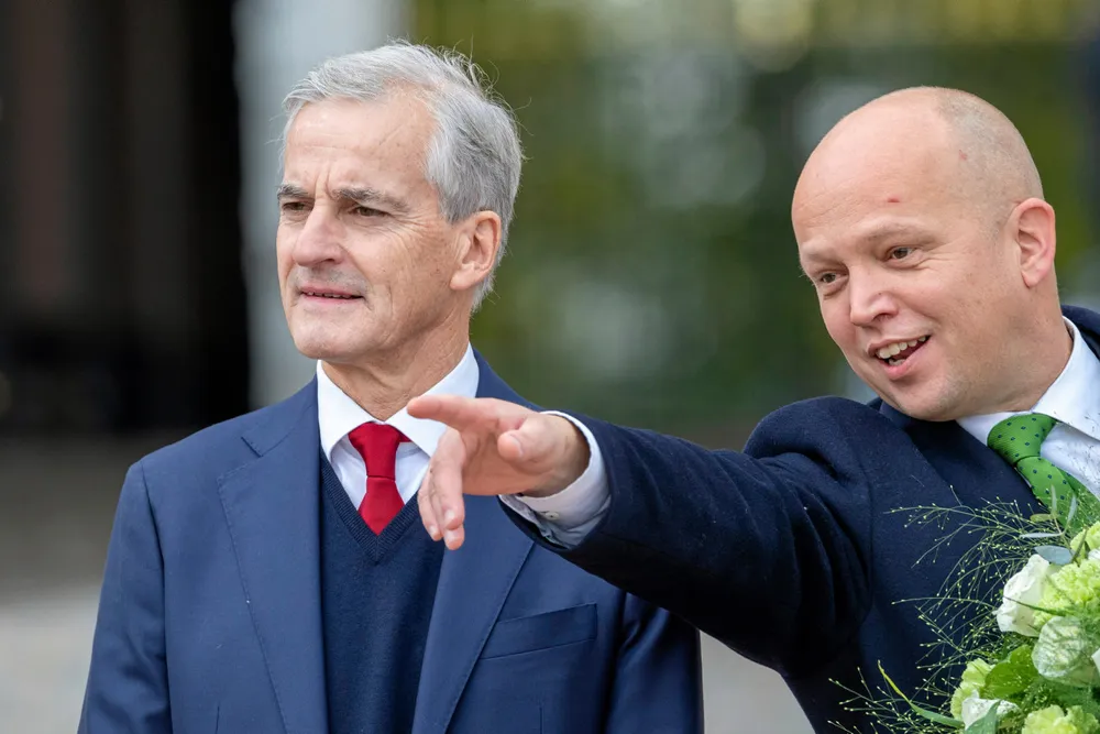Jonas Gahr Støre og Trygve Slagsvold Vedum på slottsplassen med sin regjering etter sitt første statsråd på slottet i 2021. Nå har de klart lovforslaget til grunnrenteskatt på havbruk som skal legges frem for Stortinget.Foto: Gunnar Lier