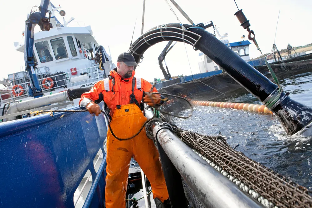 Røkter Stig Skarstad tar laksen om bord i brønnbåt, hvor den blir badet i hydrogenperoksid for å bli kvitt lakselus. Fiskeridirektoratet ville fjerne regelen om hvor lusevannet kunne dumpes, men har nå snudd. Forslaget burde aldri vært fremmet, mener Fiskeribladet.Foto: Ole Morten Melgård