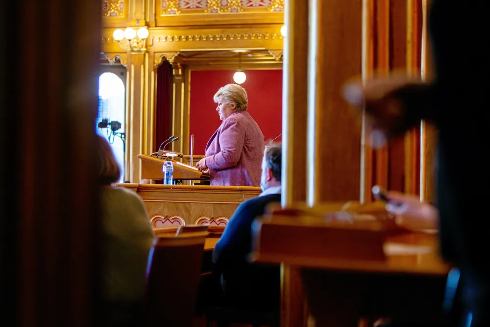 PÅ STORTINGET: Statsminister Erna Solberg redegjorde i går om håndteringen av koronapandemien i Stortinget. Nå truer hun med nye nasjonale tiltak.Foto: Javad Parsa