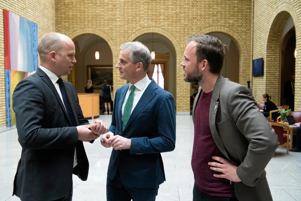 Trygve Slagsvold Vedum ,Jonas Gahr Støre og Audun Lysbakken i vandrehallen på Stortinget. Usikkerhet rundt EØS-avtalen bør bekymre sjømatnæringen, mener Fiskeribladet.Foto: Per Ståle Bugjerde